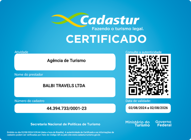Somos uma Agência certificada pelo Sistema de Cadastro de Pessoas Jurídicas do Setor de Turismo do Governo Federal - CADASTUR. Seguimos todos os regulamentos e normas do setor, garantindo segurança e transparência em cada etapa de sua viagem.